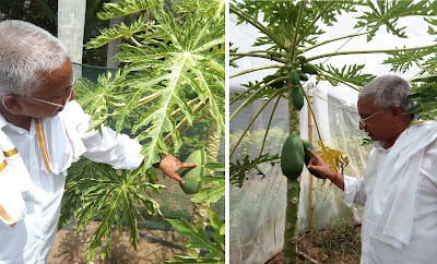 He has cultivated a special two acres of land just to give demo to the farmers. Here papaya plants afflicted with the virus attack are grown on one half while the other half contains the healthy plants protected by the net yielding good fruits. He wants to motivate farmers to once take up papaya cultivation, as huge subsidy is provided for women farmers by the government of India. He is also planning to take a patent for papaya seeds after getting feed back from the farmers.